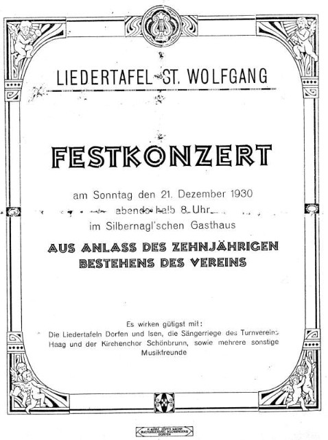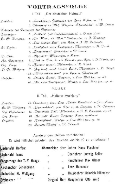 Stehend von links: Silbernagl Anton, Luber Johann, Renner Hartl (Schmiedberg), Renner Josef, Wimmer Anton (Klaus), Stummer Otto, Herrneder Hans, Ostner Hans, Daxer Josef, Kranzmayr Paul, Untergehrer Bartl, Schratzenstaller Franz. Sitzend von links: Greiml Bartholomäus, Haßfurter Karl, Weiß Otto (Lehrer), Hillmayer Heinrich (Lehrer), Primbs Fritz (Förster), Deisler Hugo. 1930 Festkonzert zum 10 Jährighen Bestehen |